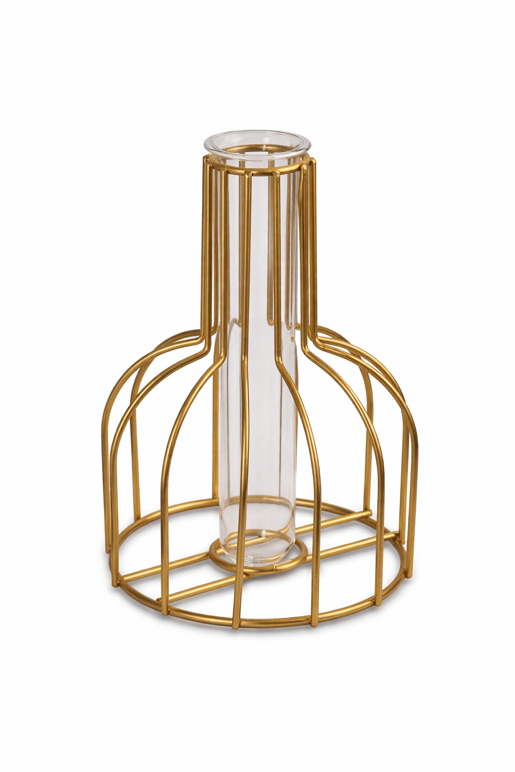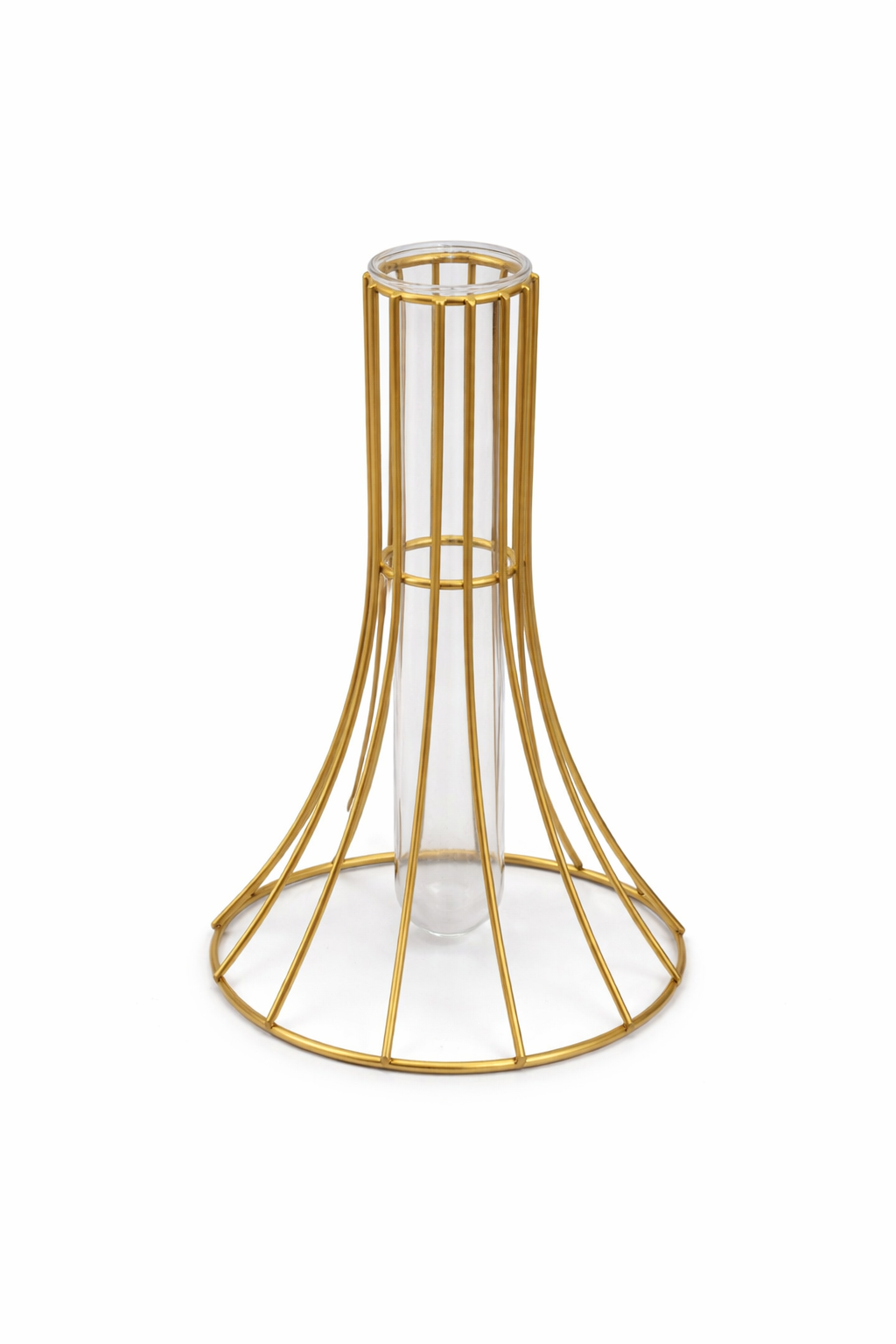 Seu design vazado em arame dourado envolve delicadamente o tubo interno de vidro, criando um visual refinado que valoriza flores naturais, artificiais ou até mesmo o uso do vaso sozinho como peça decorativa.